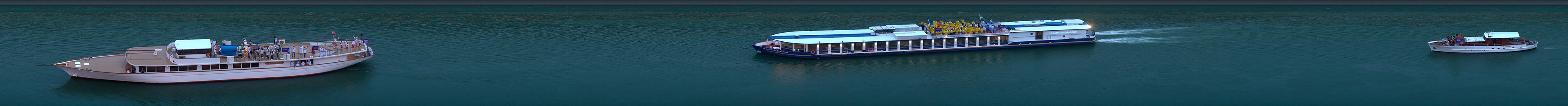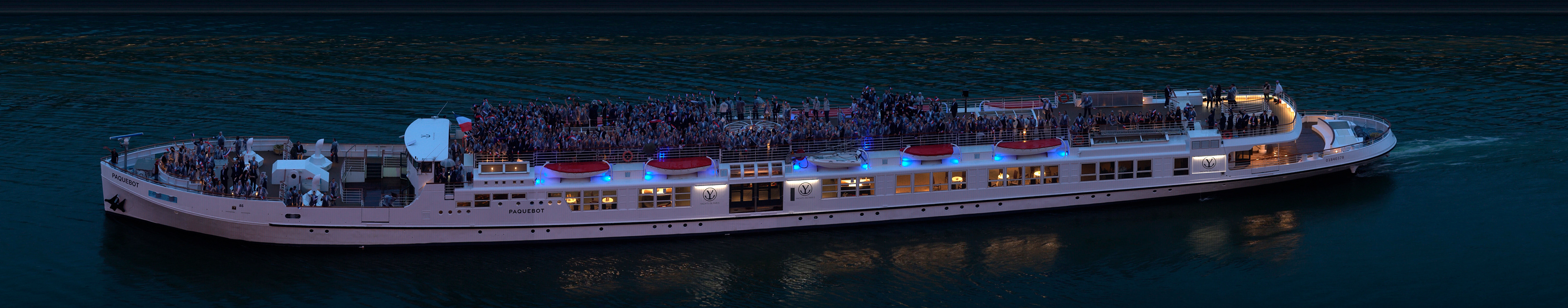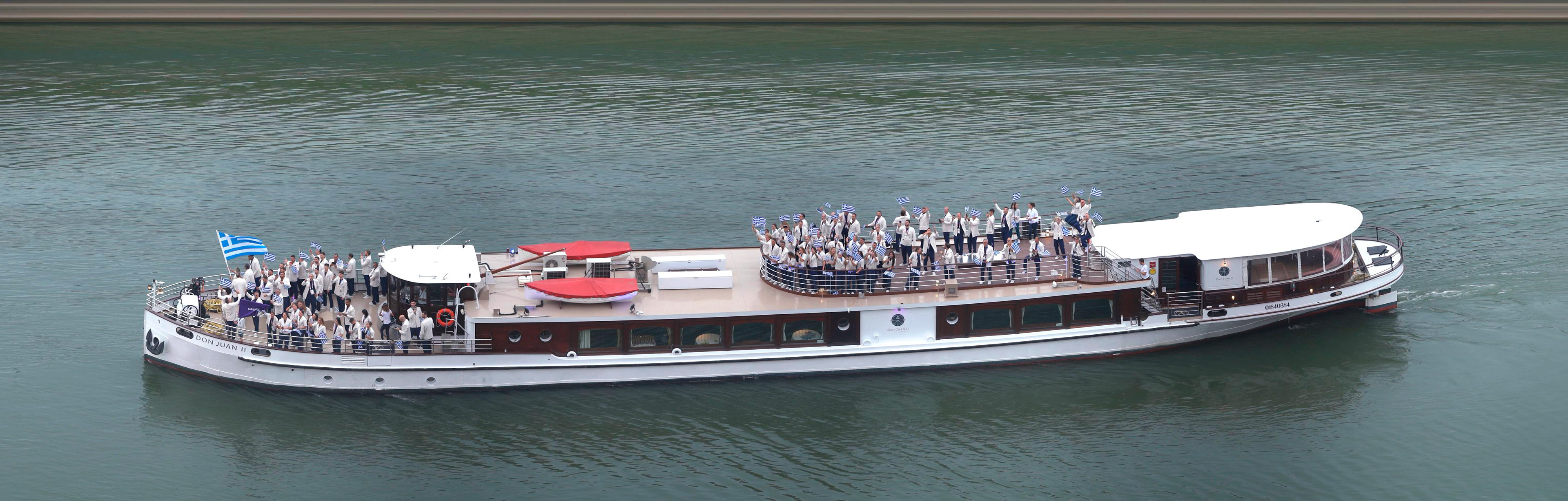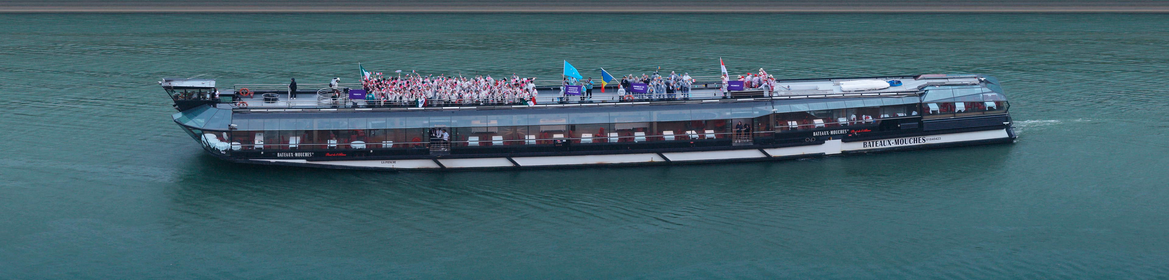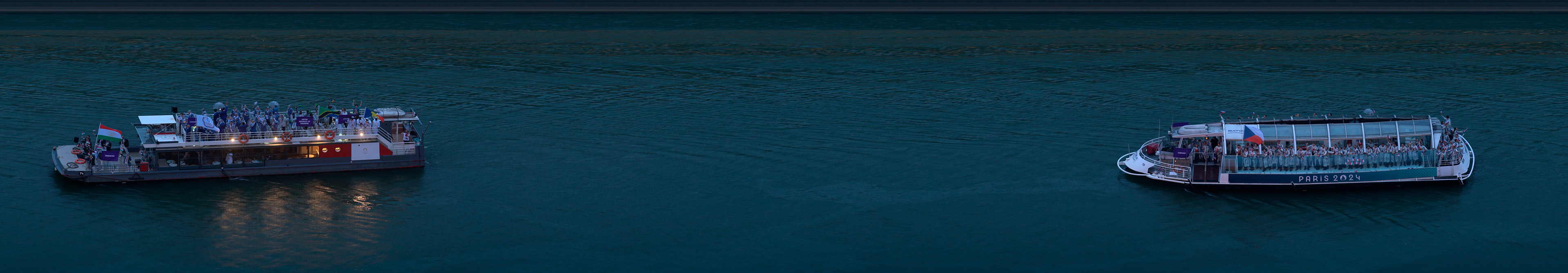 Panoramic photograph capturing all athletes and boats throughout the opening ceremony of the Paris Olympics.